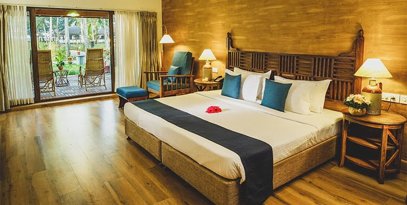 Our wooden premium villas are 400 sq ft each and adorned with traditional wooden furniture. All cottages have attached bathrooms and open to sky shower area; both having purified hot and cold water facilities.