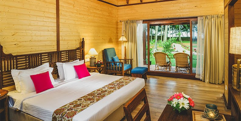 Our spacious luxury twin cottages are 421 sq. feet each and with unique statement wooden furniture. All cottages are with attached bathrooms and open to sky shower area; both having RO purified hot and cold water facilities.